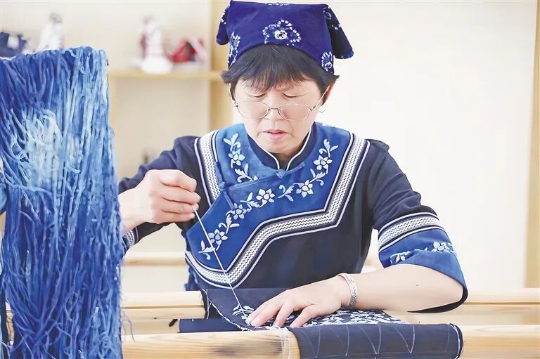 村里的文化广场上,82岁的山歌手何中华正带着青年学唱土家山歌,一旁的绣娘们飞针走线。